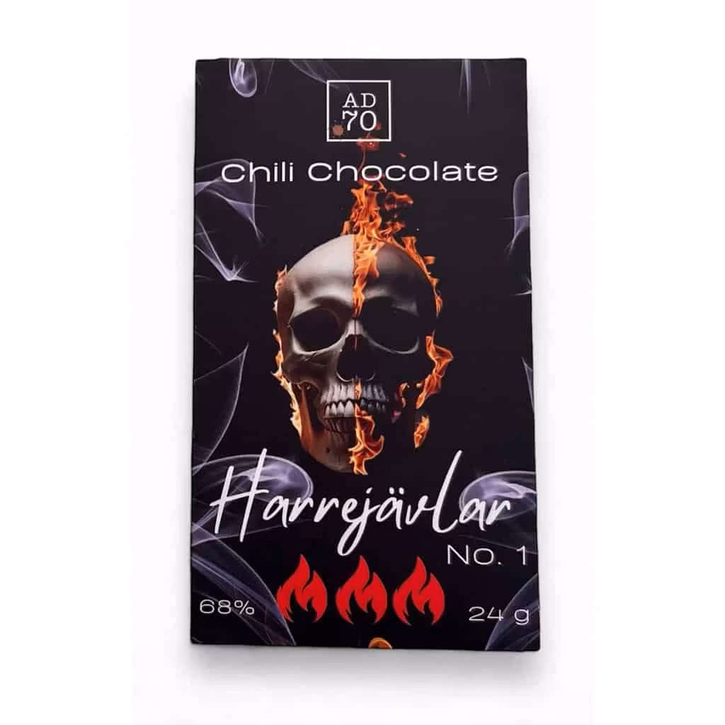 Vågar du testa den hetaste chokladen från AD70 Choklad i Lödöse? Harrejävlar No. 1 är en exklusiv mörk choklad (68%), infuserad med den eldiga Carolina Reaper. En utmaning för de mest våghalsiga chiliälskarna. Först sveps du in i den rika, silkeslena smaken av högkvalitativ choklad, innan den brännande hettan från Carolina Reaper tar över och levererar en intensiv hetta. Kombinationen av den fylliga chokladen och den kraftiga kryddan skapar en smakupplevelse utöver det vanliga, som garanterat kommer att kittla dina smaklökar och höja pulsen.