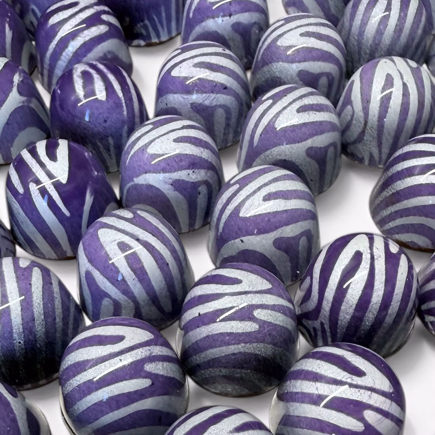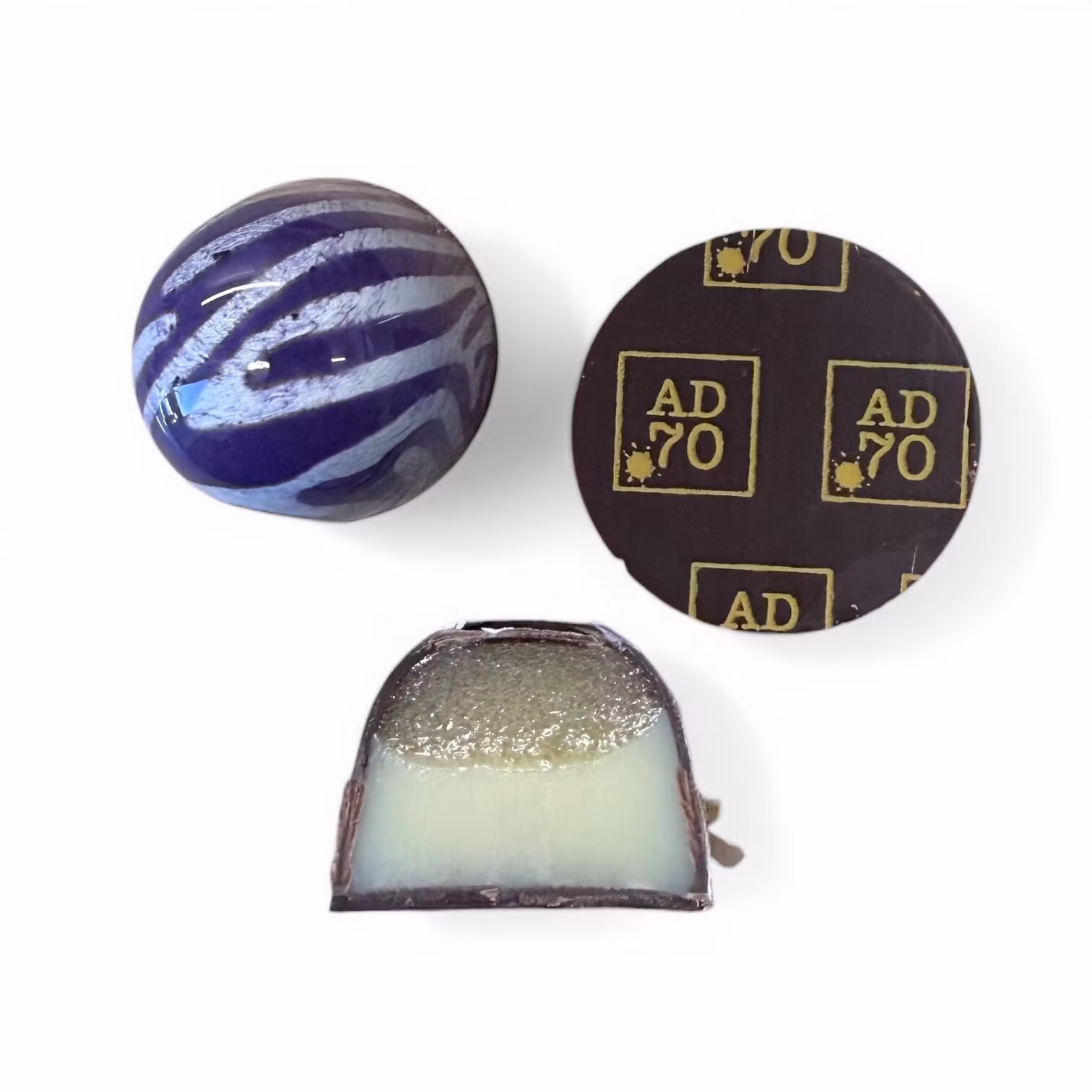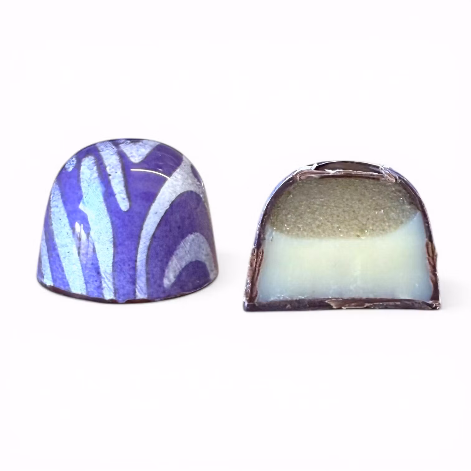 Mörk choklad i skalet, med en fyllning av flädergelé samt en ganache på vit choklad smaksatt med Earl Grey och kardemumma.
