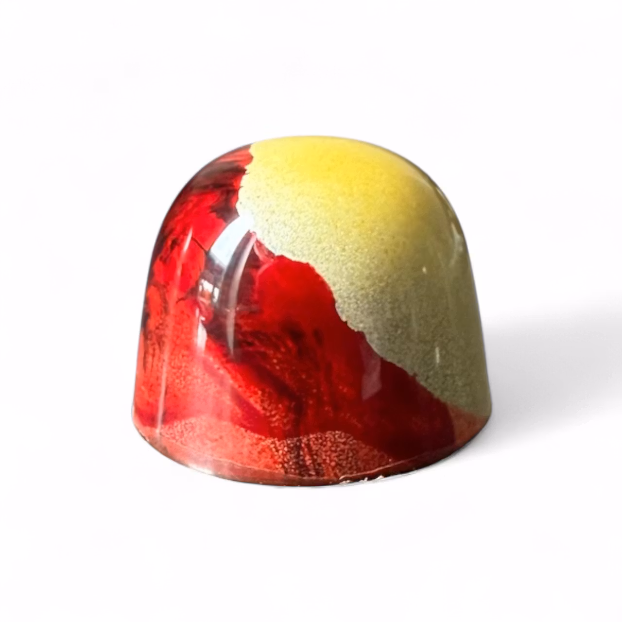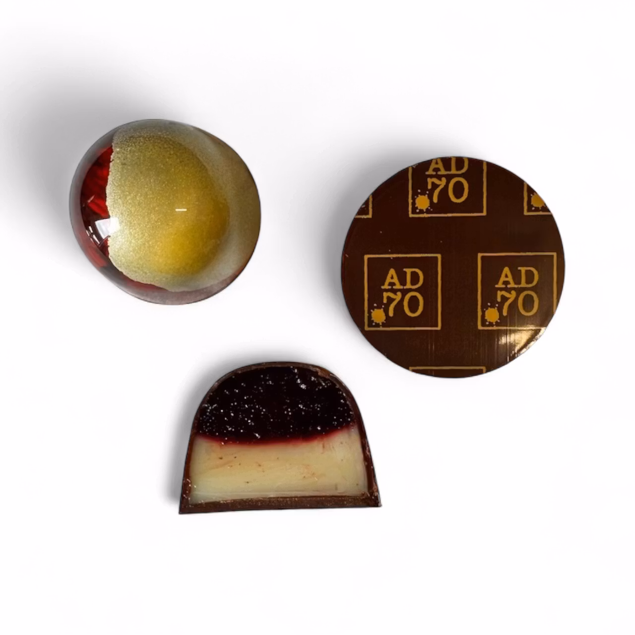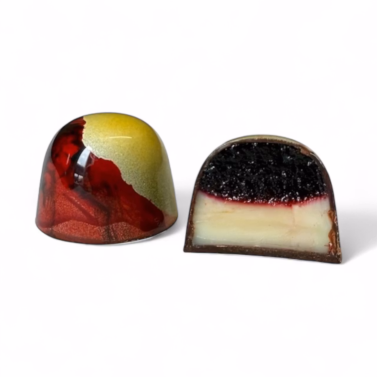 Mörk choklad med fyllning av svarta körsbär och frisk yuzu som ger en intensiv och fruktig smak.