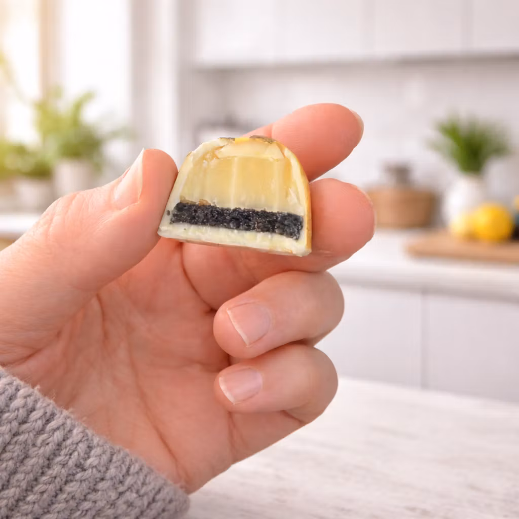 Frisk yuzu, svart sesam och vit choklad – med rostade toner som rundar av citrusen.