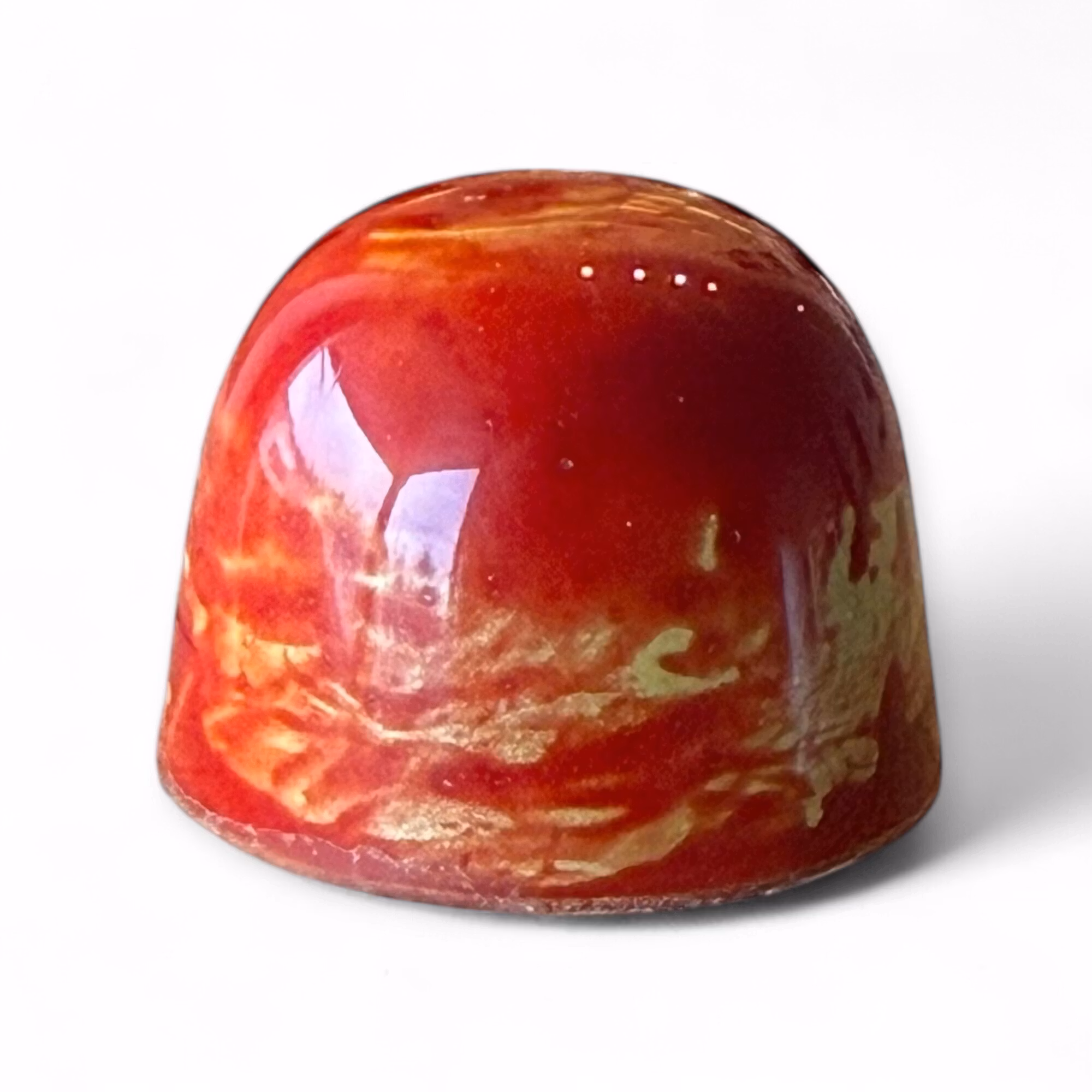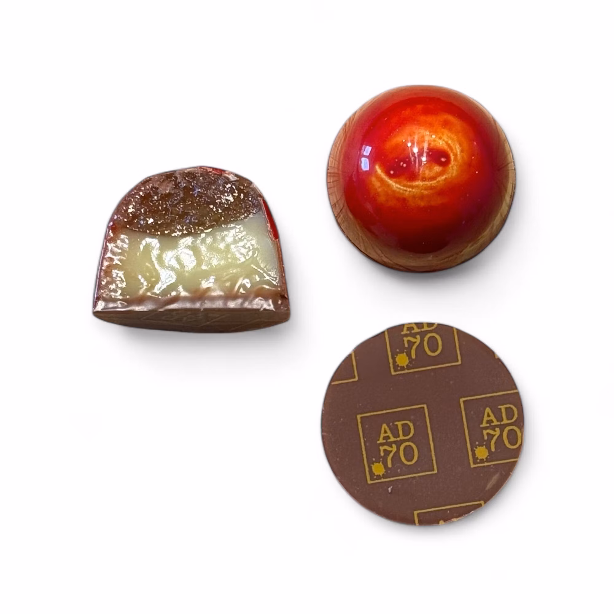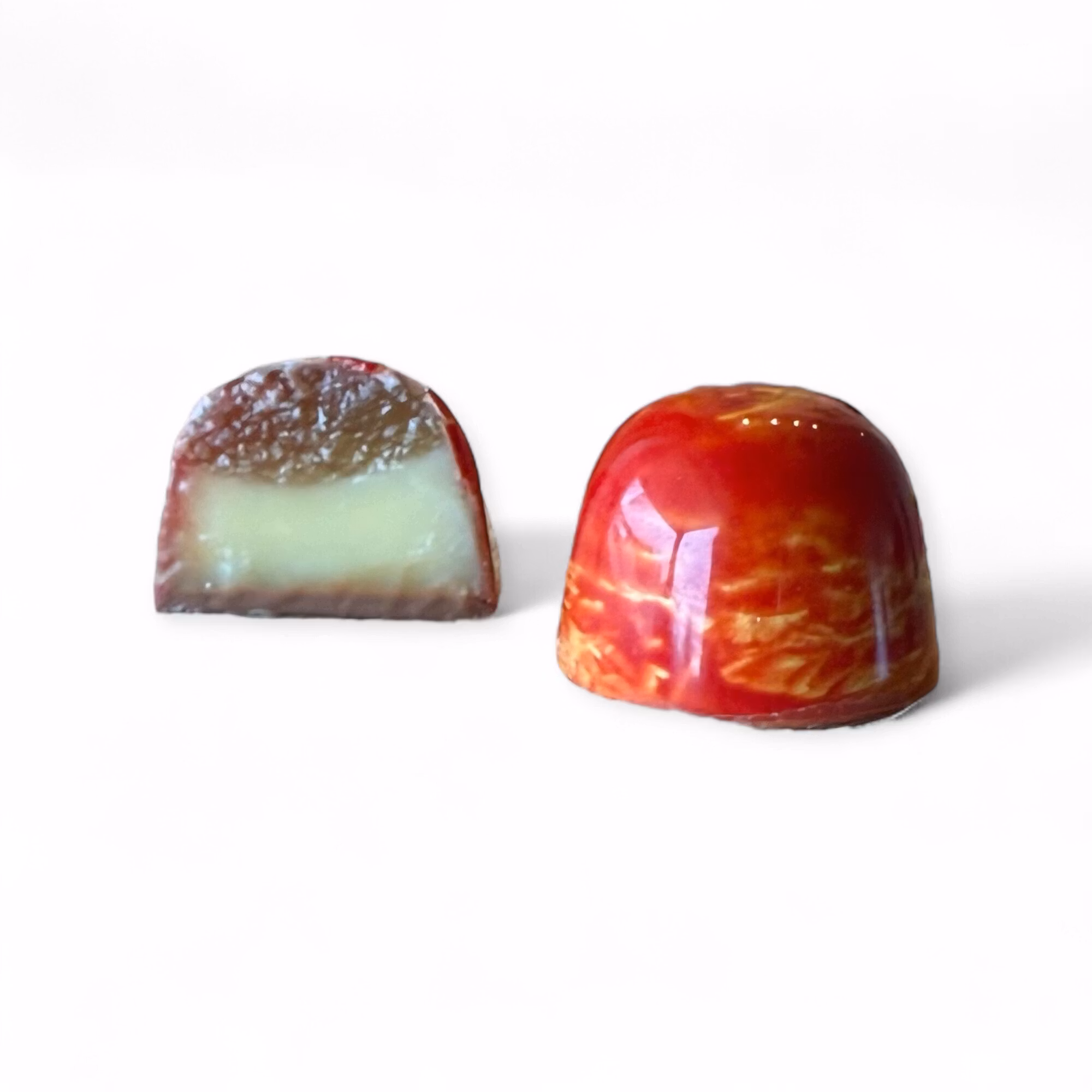 Mjölkchoklad med äppelmarmelad och en ganache med brynt smör. Söt och frisk i samma bit.