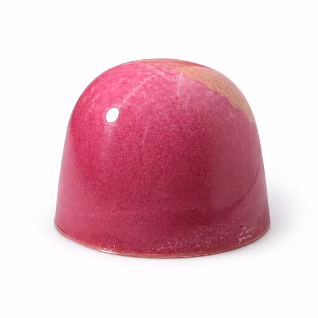 Frisk passionsfrukt, rund mjölkchokladganache med rom och ett skal av vit choklad.