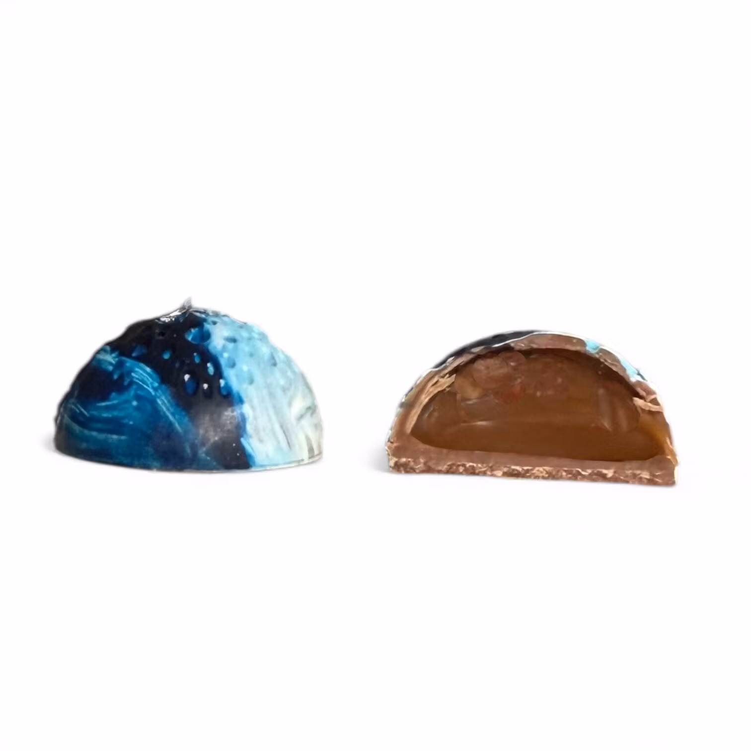 Mjölkchoklad fylld med salt kola. En pralin med smak av västkust – svår att uttala, men lätt att tycka om.