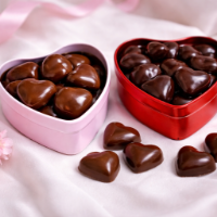 Små chokladhjärtan i en hjärtformad plåtask.